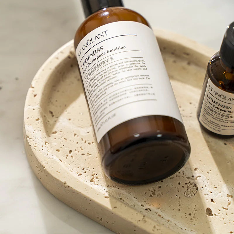 Ground your rituals in natural form. This solid travertine tray is carved with smooth edges and raw texture, making it the perfect platform for styling everyday objects - from perfume bottles to jewellery or hand soap. Its stone grain tells a unique story in every piece.